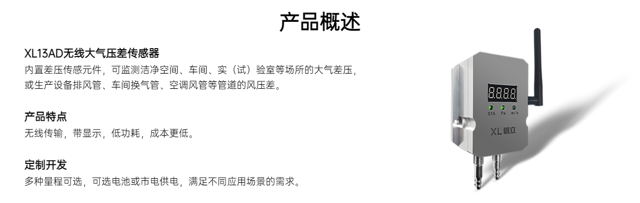 XL13AD智能壓差傳感器,按低功耗、電池供電標準設計,帶顯示,多種量程可選,體積小,安裝接線簡單、便捷,適應不同的場景的需求。