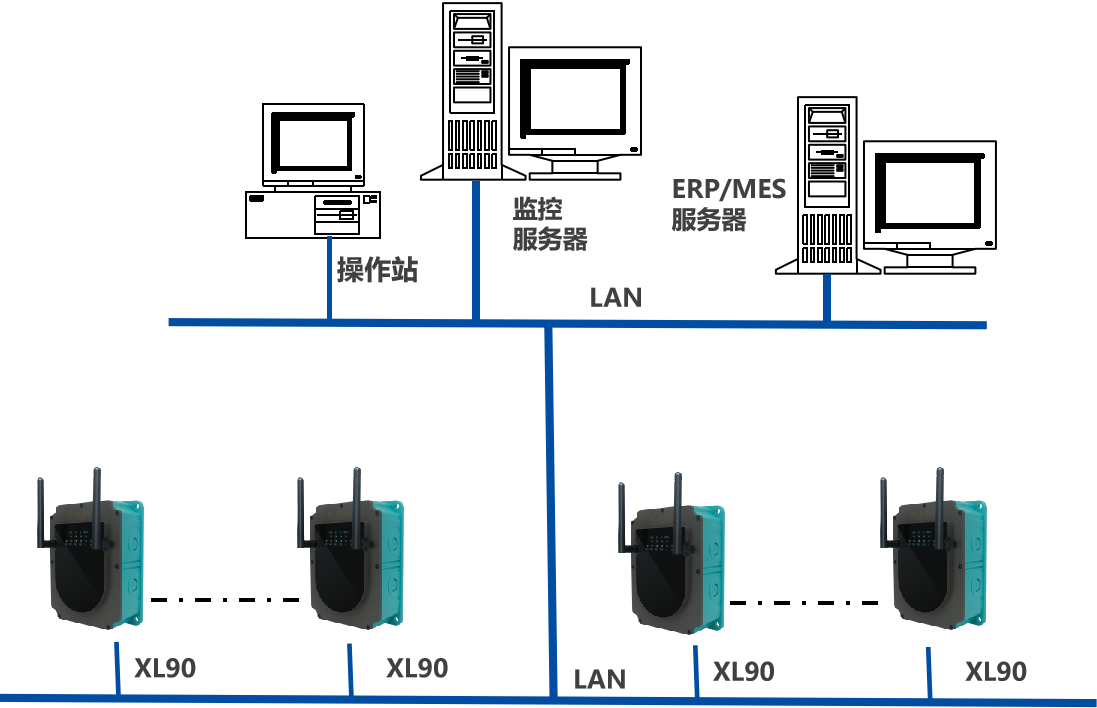 XIoT設備運行狀態監控系統,平臺由1套XL.Cloud軟件、1臺監控服務器構成;通信網絡多臺XL90物聯網關,及LAN構成