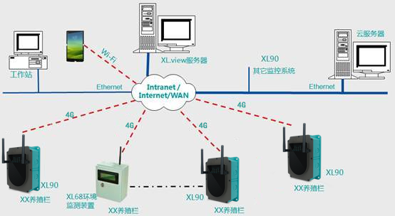 XL68智能環(huán)境監(jiān)測終端(裝置),采集空氣溫濕度、H?S、NH?、O?、CO?等等氣體濃度,光照、差壓等等信號;簡單應(yīng)用中選擇XL51溫濕度傳感器采集空氣溫濕度;XL60無線采集裝置控制養(yǎng)殖欄內(nèi)的參數(shù),起動風(fēng)機(jī)、加熱裝置、濕簾、照明,起動聲光報警器,采集用水量、用電量、水壓等等用戶關(guān)注的參數(shù)。