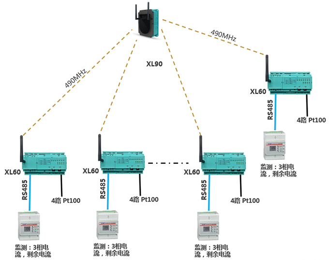 配置1臺XL60智能采集裝置,通過AI模塊采集4只溫度探頭信號,通過RS485讀取電氣監(jiān)測儀表數據;XL60通過無線上傳采集的電氣、溫度數據至XL90物聯(lián)網關