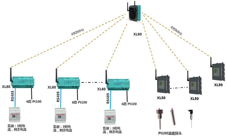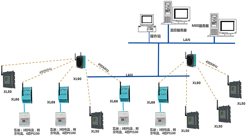 由2臺XL90物聯(lián)網關,35臺XL66無線轉換器、28臺XL50,及電氣儀表、溫度傳感器等等構成