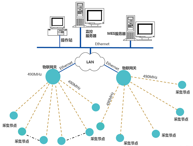 采集節(jié)點,通過490MHz無線上傳數據至物聯(lián)網關,網關通過Ethernet,接入LAN,推送數據至MES服務器