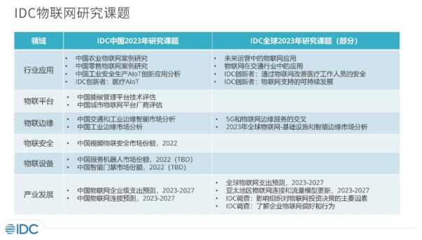 2023年IDC持續跟進物聯網的研究,圍繞重點行業應用、物聯平臺、物聯邊緣、物聯安全及物聯感知新設備技術開展,具體研究課題如下:
