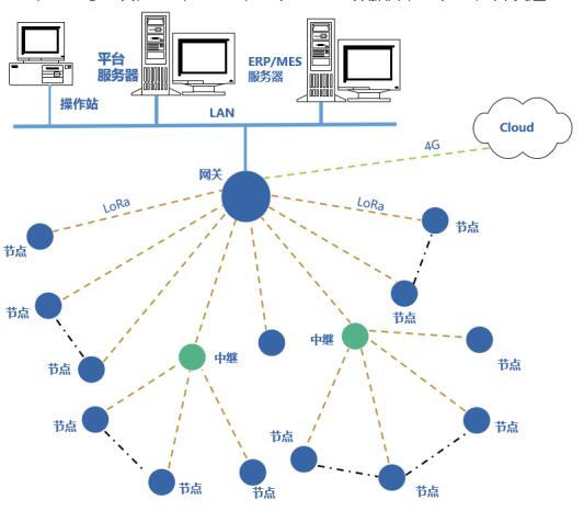 網(wǎng)關(guān)無線讀取所覆蓋區(qū)域內(nèi)監(jiān)測點的數(shù)據(jù),進行處理、協(xié)議轉(zhuǎn)換,通過局域網(wǎng)轉(zhuǎn)發(fā)數(shù)據(jù)至MES、ERP、EMS等工廠數(shù)字化平臺,對數(shù)據(jù)進行分析,根據(jù)不同的報警閾值實現(xiàn)預警。