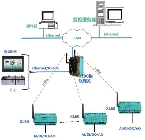 方案一:XL60無線采集裝置采集的現(xiàn)場設(shè)備數(shù)據(jù),采用LoRa無線傳輸方式,傳輸至XL90物聯(lián)網(wǎng)關(guān),經(jīng)協(xié)議轉(zhuǎn)換后將數(shù)據(jù)通過Ethernet或RS485上傳至監(jiān)控平臺、PLC、觸摸屏、控制器等設(shè)備。