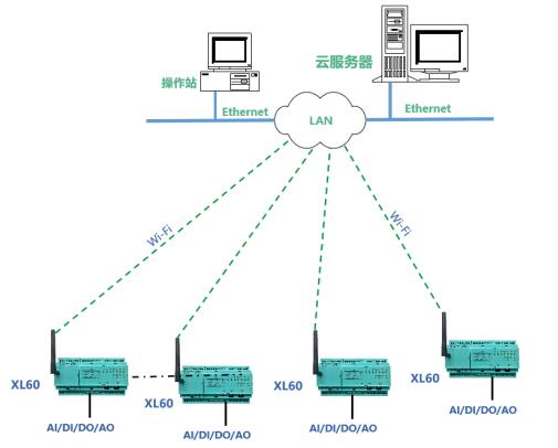 方案二:對于覆蓋Wi-Fi的區(qū)域,XL60無線采集裝置可直接通過Wi-Fi接入局域網(wǎng),通過LAN直接推送數(shù)據(jù)至監(jiān)控服務(wù)器。