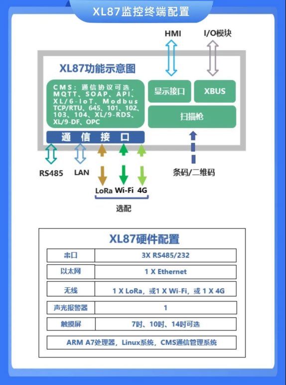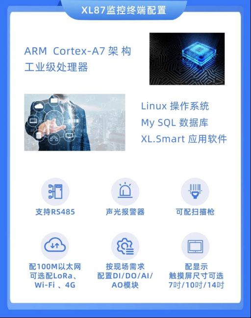 XL87監(jiān)控終端,以一套生產(chǎn)設(shè)備、一條產(chǎn)線、或是多臺相關(guān)聯(lián)的機(jī)器設(shè)備作為一個監(jiān)測對象,可實現(xiàn)設(shè)備數(shù)據(jù)采集、運(yùn)行狀態(tài)監(jiān)測、物料追溯、設(shè)備信息讀取、機(jī)器啟停控制等功能。