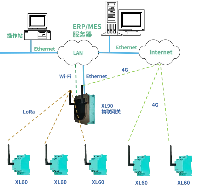 接入企業(yè)監(jiān)控平臺(tái):XL60無(wú)線采集模塊采用LoRa無(wú)線傳輸數(shù)據(jù)至XL90網(wǎng)關(guān),網(wǎng)關(guān)通過(guò)Ethernet/WiFi等方式接入監(jiān)控平臺(tái);